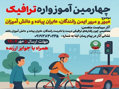 موضوع: رفتارهای ترافیکی درست یا نادرست رانندگان؛ عابران پیاده و دانش آموزان در دو بخش: حرفهای و مبتدی قالبها: نقاشی، خاطره، داستان کوتاه، فیلم کوتاه و عکس
